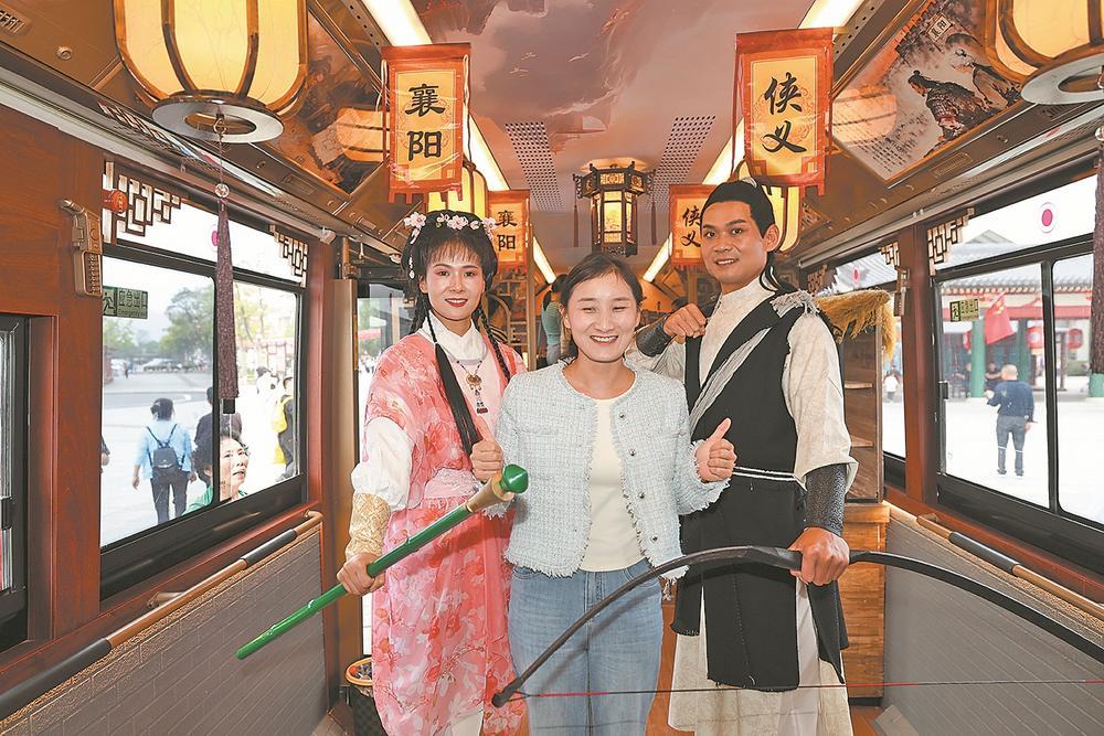 “郭靖”、“黄蓉”驾驶公交车搭载游客游览古